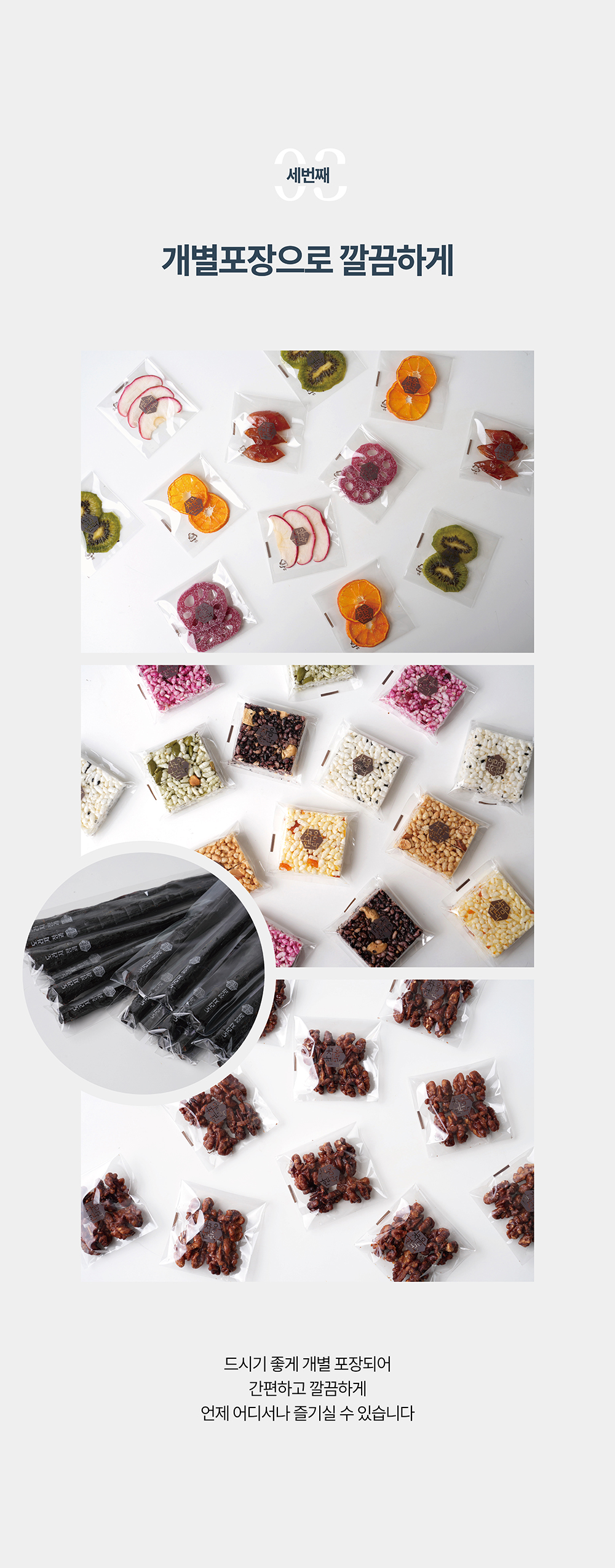 . 백미강정 : 쌀(국산)83%, 검은깨(중국산)7%, [물엿,설탕,식용유(대두100% 미국,브라질,파라과이 등)]10% . 귤강정 : 쌀(국산)78%, 귤정과(국산)12%, 치자분말(국산)0.8%, [물엿,설탕,식용유(대두99.9% 미국,아르헨티나,벨기에 등)]9% . 백년초강정 : 쌀(국산)80%, 크랜베리(미국)10%, 백년초분말(국산)1%, [물엿,설탕,식용유(대두99.9% 미국,아르헨티나,벨기에 등)]9% . 파래강정 : 쌀(국산)70%, 호박씨(중국산)10%, 피스타치오(미국산)9%, 파래분말(국산)1%, 파래분태(국산)1%, [물엿,설탕,식용유(대두99.9% 미국,아르헨티나,벨기에 등)]9% .현미강정 : 현미(국산)75%, 아몬드(미국산)15%, [물엿,설탕,식용유(대두99.9% 미국,아르헨티나,벨기에 등)]10% . 흑미강정 : 찰흑미(국산)75%, 캐슈넛(베트남산)15%, [물엿,설탕,식용유(대두99.9% 미국,아르헨티나,벨기에 등)]10% . 호두강정 : 호두