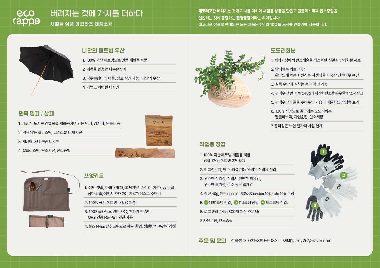 에코컨서번시Y는 지역 자원과 사람을 연결하여 순환경제를 실현하는 사회적협동조합입니다. 업사이클링 제품 제작, 나무심기, PET 수거장치 개발 등 다양한 친환경 활동을 전개하고 있으며, ‘에코라포’ 브랜드를 통해 공감 기반의 자원순환 문화를 확산시키고 있습니다.